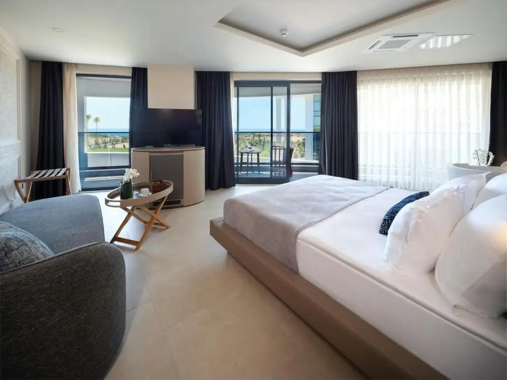1 King Suite (180 м2, прямой вид на море, балкон, гостиная, спальня, двуспальная кровать, ванная комната, джакузи в номере, макс. 2 чел.).