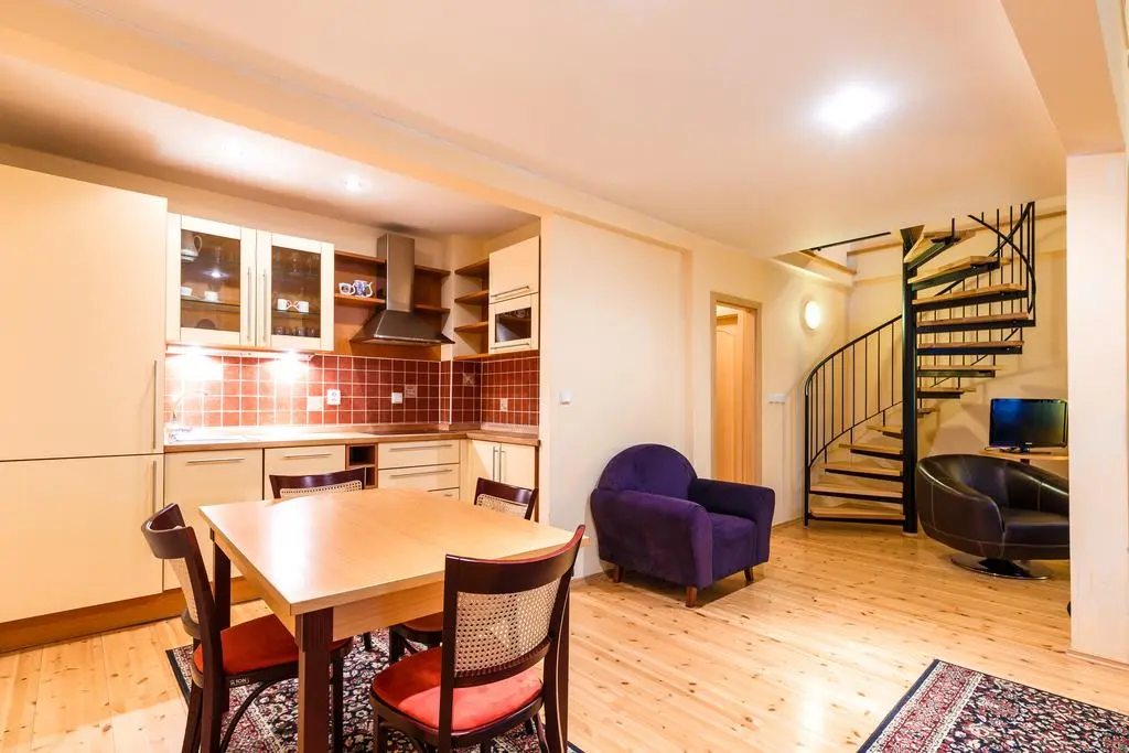 Apartament: двухуровневый номер, 1 этаж — 1 гостиная с оборудованным кухонным уголком, 1 туалет, 2 этаж — 2 спальни (максимально на 4 человека), 1 ванная комната с душем и туалетом, вид на улицу и во двор, размер номера 70 м2.