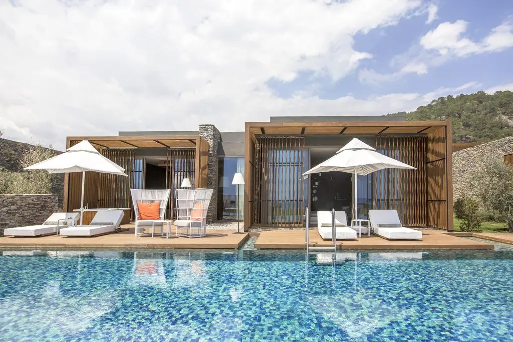 - 1 двухэтажная Presidential villa 5 bedrooms (с видом на море, с индивидуальным бассейном, садом и террасой с джакузи, гостиная, кухня, 4 отдельных спален, 1 комната может быть использована как офис/комната для гостей, главная спальня с джакузи и душем, 6 ванных комнат с душем, сауна, парная, турецкая баня, крытый бассейн, комната для фитнеса, прямой выход из сада к пляжу с эксклюзивными павильонами, макс. 14 чел. + 1 инфант, 450 м2). Стиральная и посудомоечная машины, холодильник, павильон закреплен за виллой и т.д.