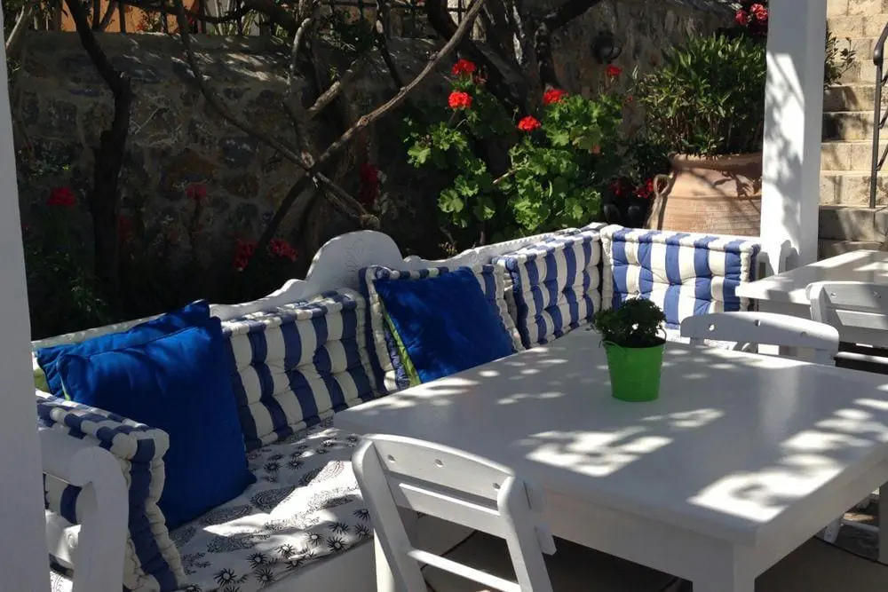 Villa (макс. 4+1) 2 спальни с традиционными кроватями Линдоса, гостиная с диван-кроватью, кухонный уголок, 2 ванные комнаты с душем, камин в зимнее время, терраса с видом на бухту Линдоса