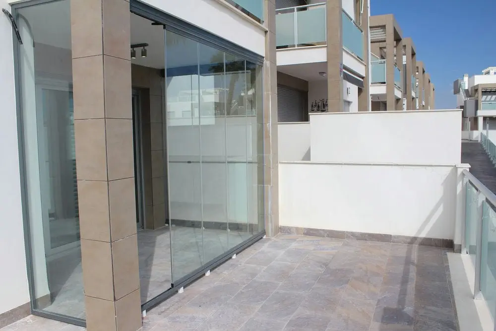 Зал достаточно большой и имеет выход на большую террасу с видом на внутреннюю территорию и бассейн,часть террасы застекленная.