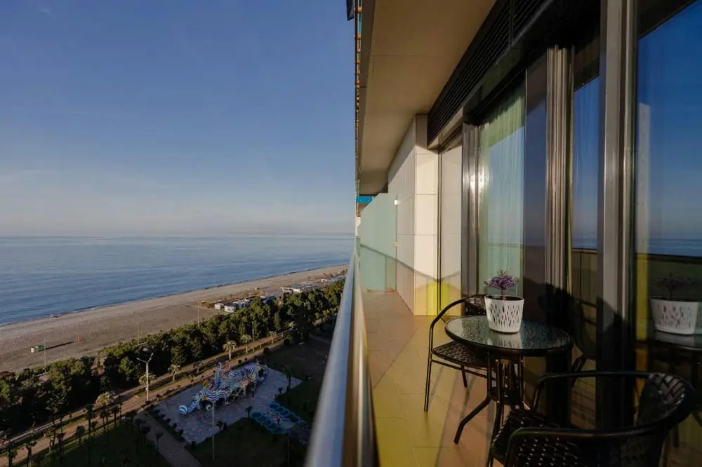 Отель расположен на 11-14 этажах (ресепшн 11 этаж) в Bellevue Residence, рядом с Hilton Batumi. Всего 54 номера. Номера для некурящих.