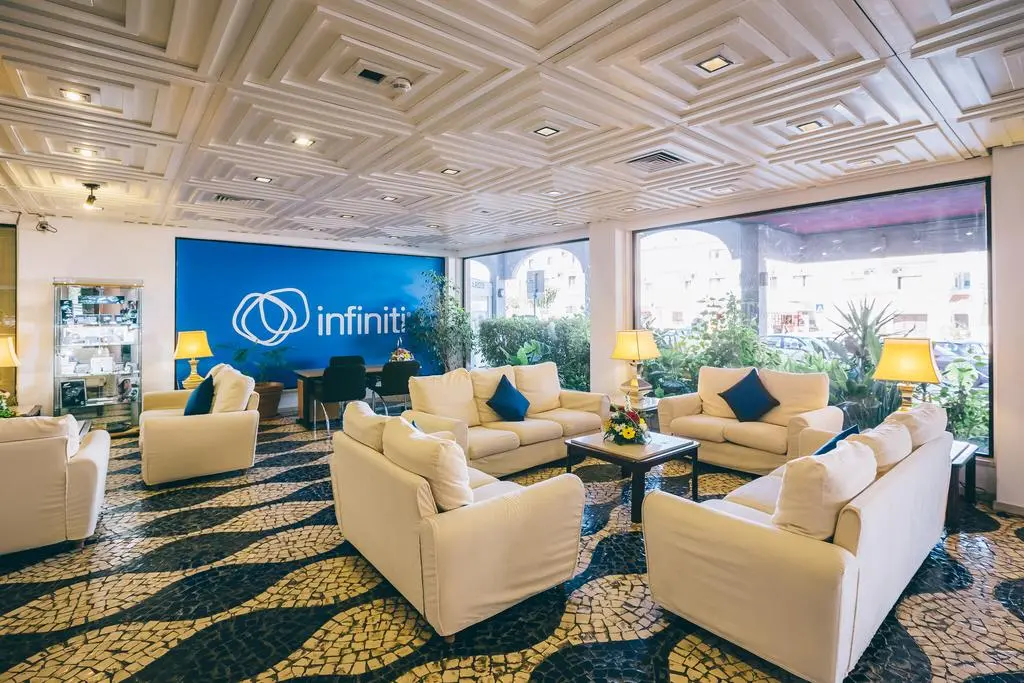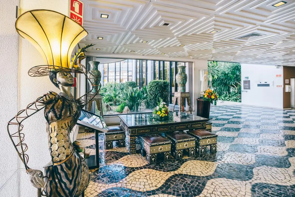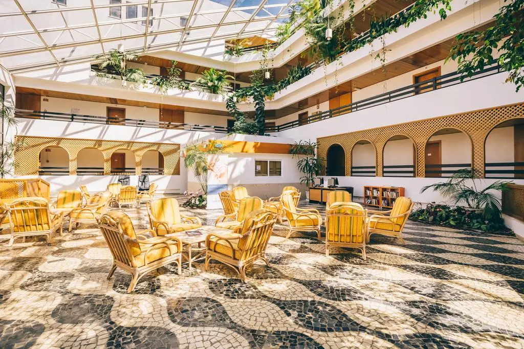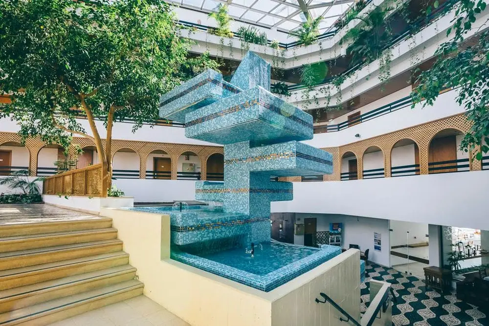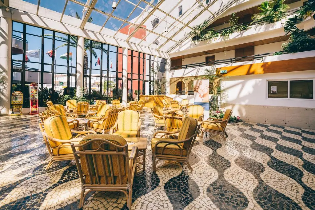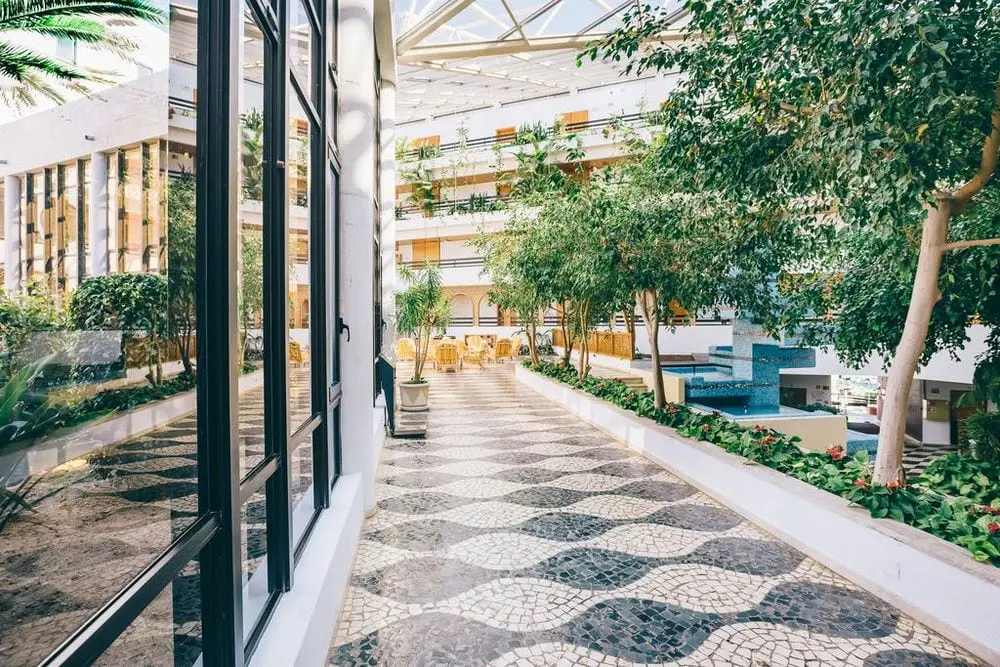 Лобби со стеклянной крышей, тропическими растениями, различными зонами для отдыха и фонтанами оформлено в стиле атриума.