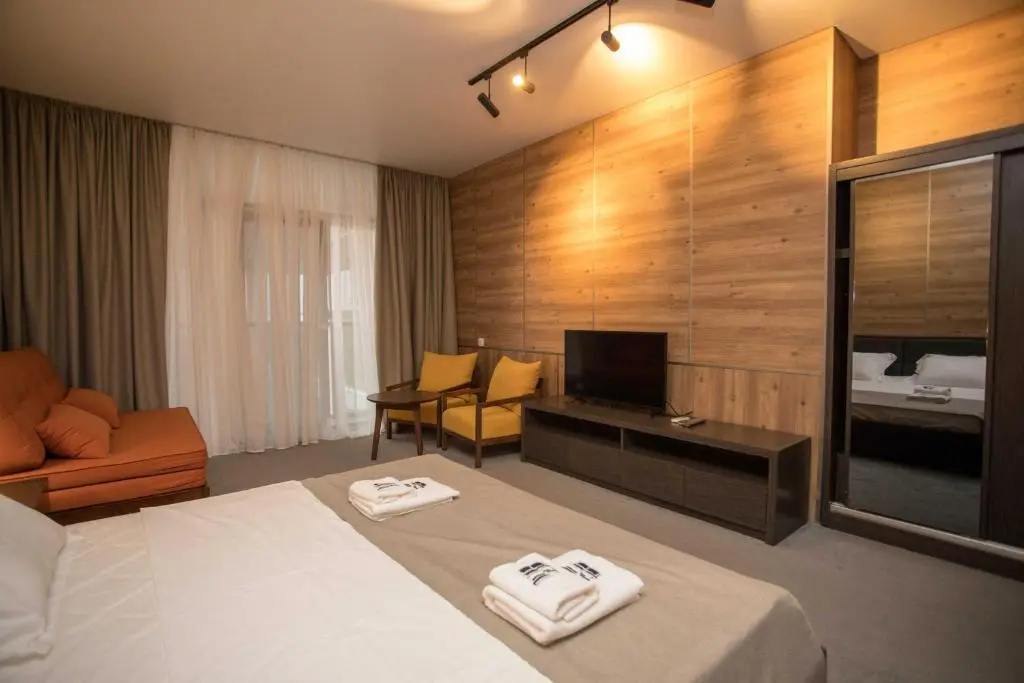 Завтрак "шведский стол" сервируется в баре утром, что позволят гостям запастись энергией на день. Бар в саду — это то место, где можно отлично отдохнуть, наслаждаясь любимым напитком. Среди заведений, в которых можно поужинать, вы найдете Beliy Parus и Chkimarte. Они находятся в 5 минутах ходьбы от отеля.