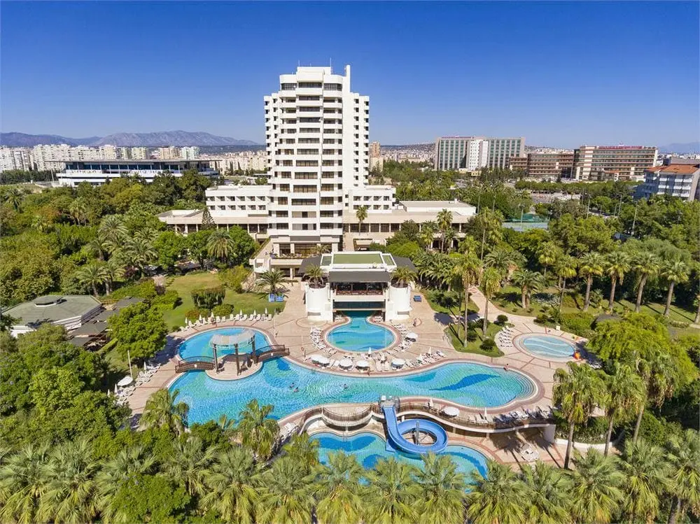 в 18 км от аэропорта, в 1 км от центра г. Анталья, на высоком берегу.