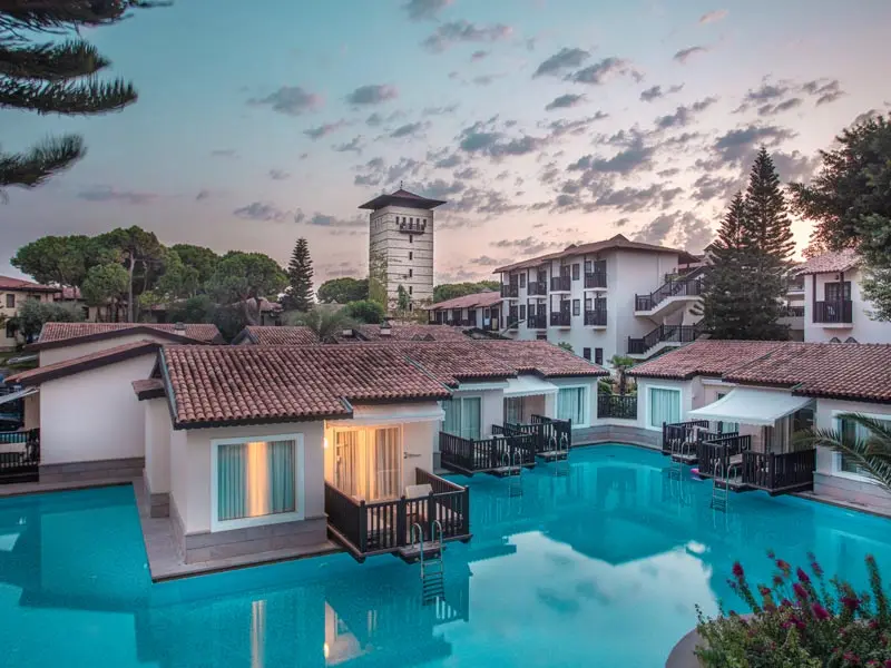 в 35 км от аэропорта, в 45 км от центра г. Анталья, в 700 м от г. Белек, на берегу моря.