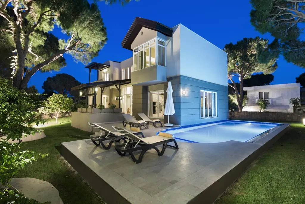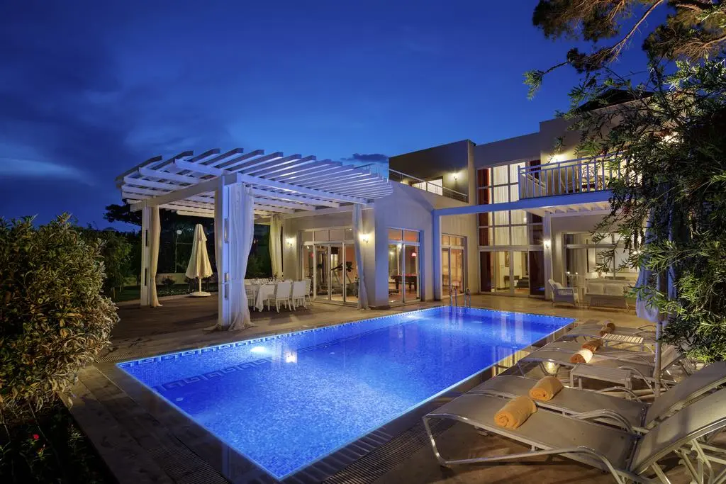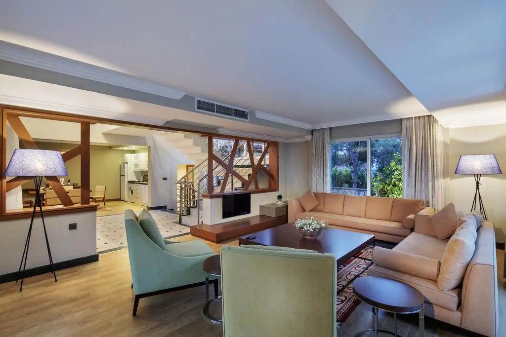 4 двухэтажных deluxe villa (на первом этаже: гостиная с кухней (оборудована обеденной зоной и мягкой мебелью), терраса, телевизор, ванная, спальня с дверью; на втором этаже: 2 спальни с дверью, 2 ванные комнаты; приватный открытый бассейн, макс 6 чел., 175 м2),