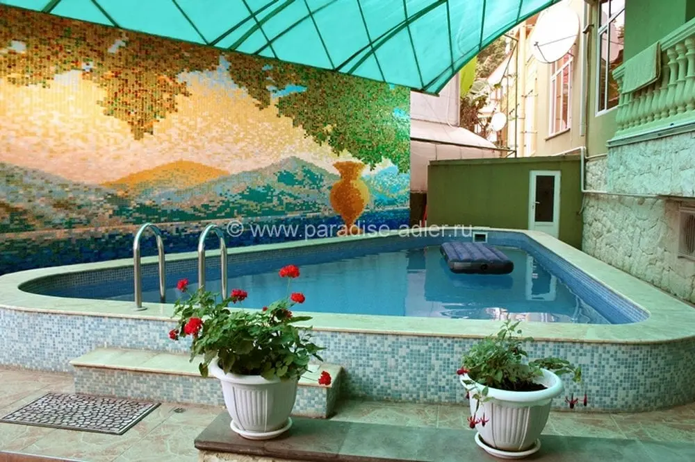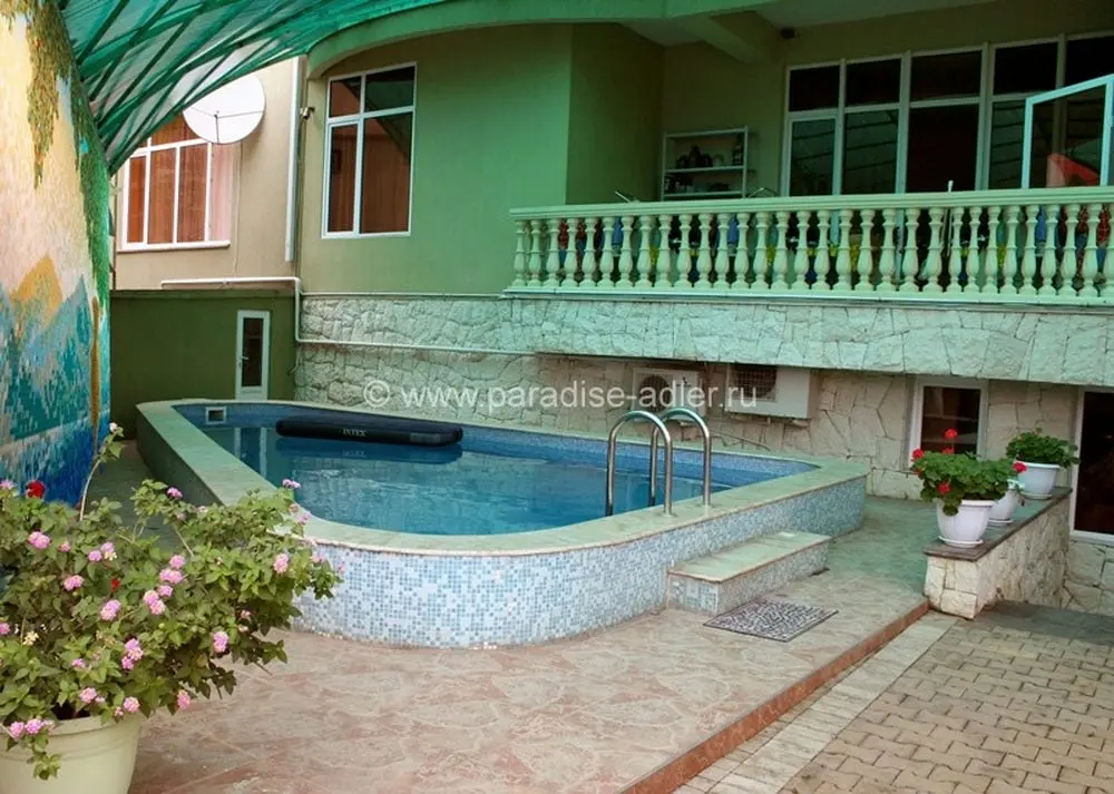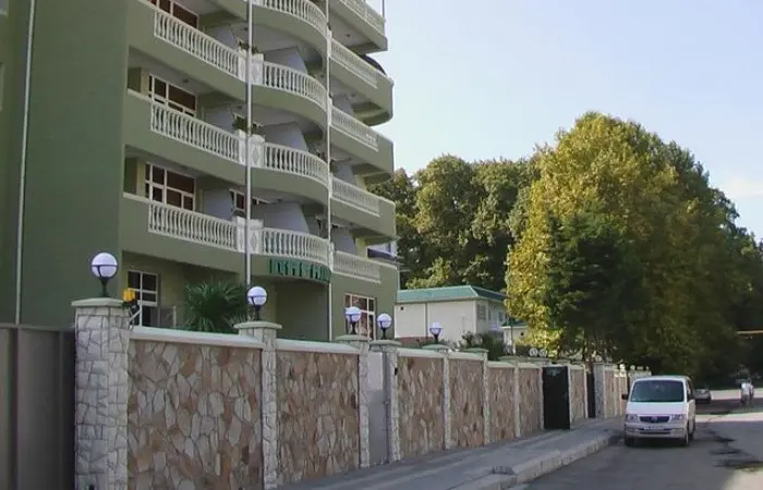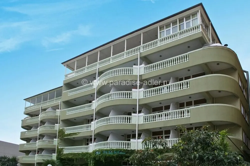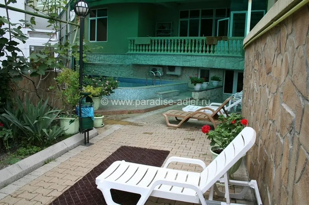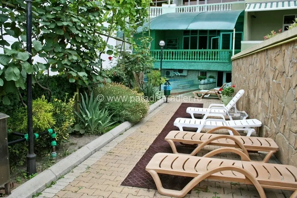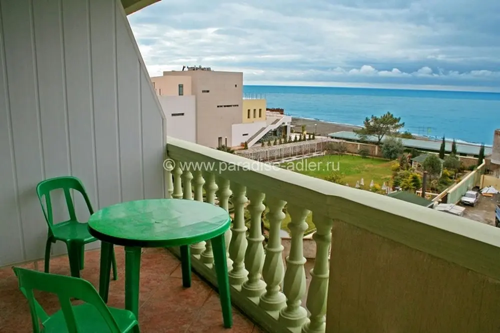 Все номера имеют телефоны и центральную систему кондиционирования, все балконы с видом на море или горы. Пансионат имеет небольшую уютную территорию с клумбами, фонтаном, открытым бассейном и прямым выходом к пляжу.