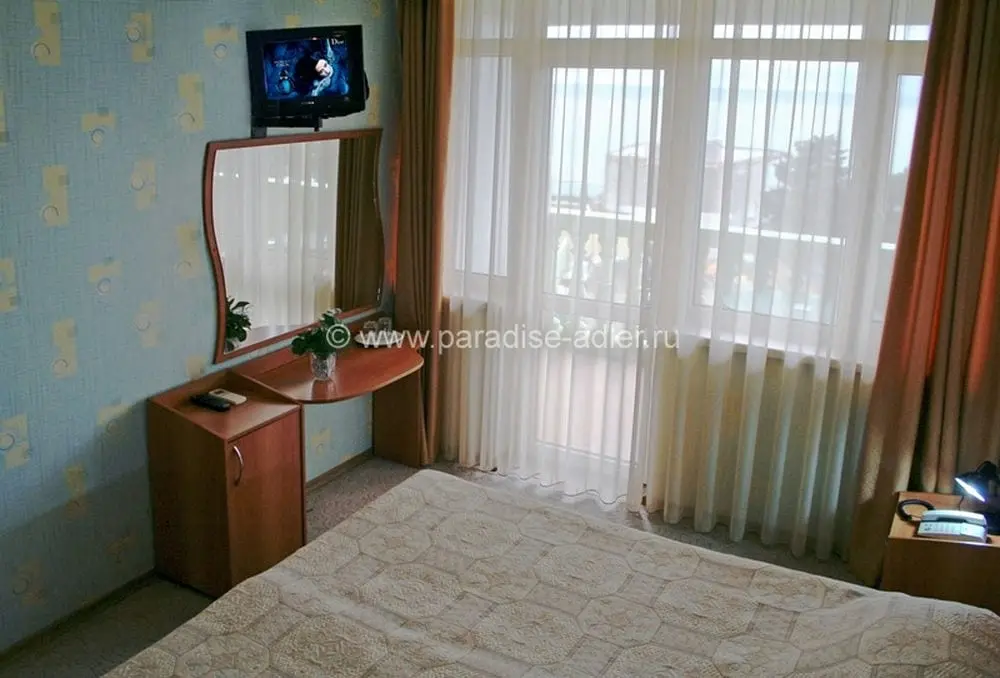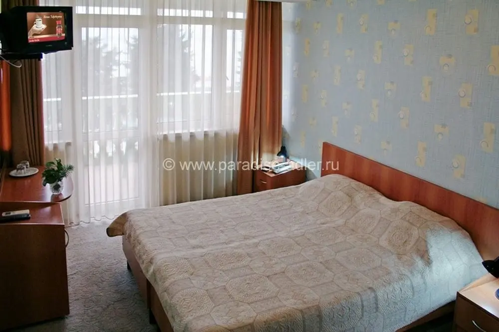В номере: двуспальная кровать, диван, санузел с ванной, кондиционер, телевизор, холодильник, лоджия с пластиковой мебелью и сушилкой для белья; телефон, смена белья – 1 раз в 5 дней.
