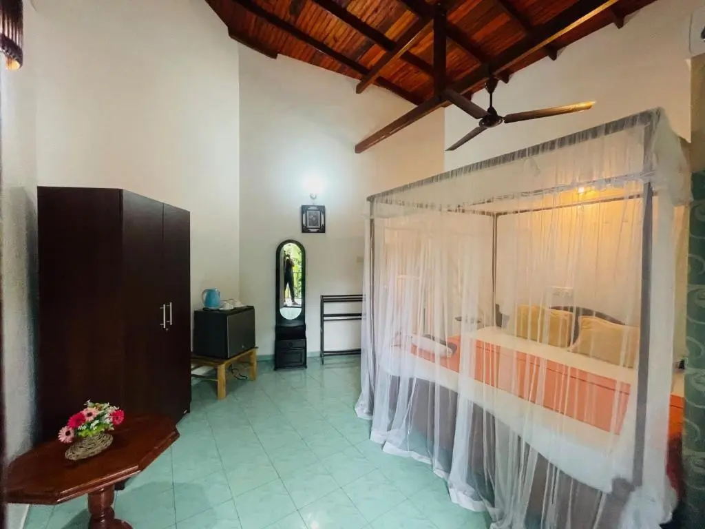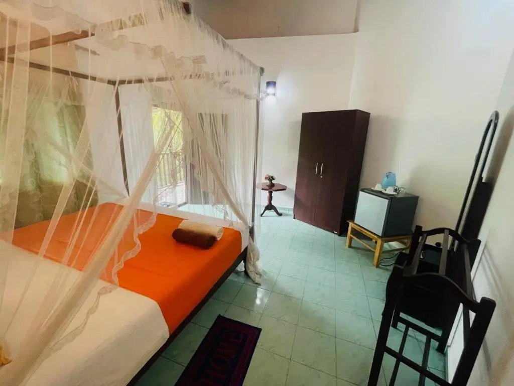 Номер: главное здание, на нижнем и 1, 3 этажах, 16 кв. м, спальня, кровать King-size, ванная комната, общий балкон, окна (можно открывать), вид на океан.