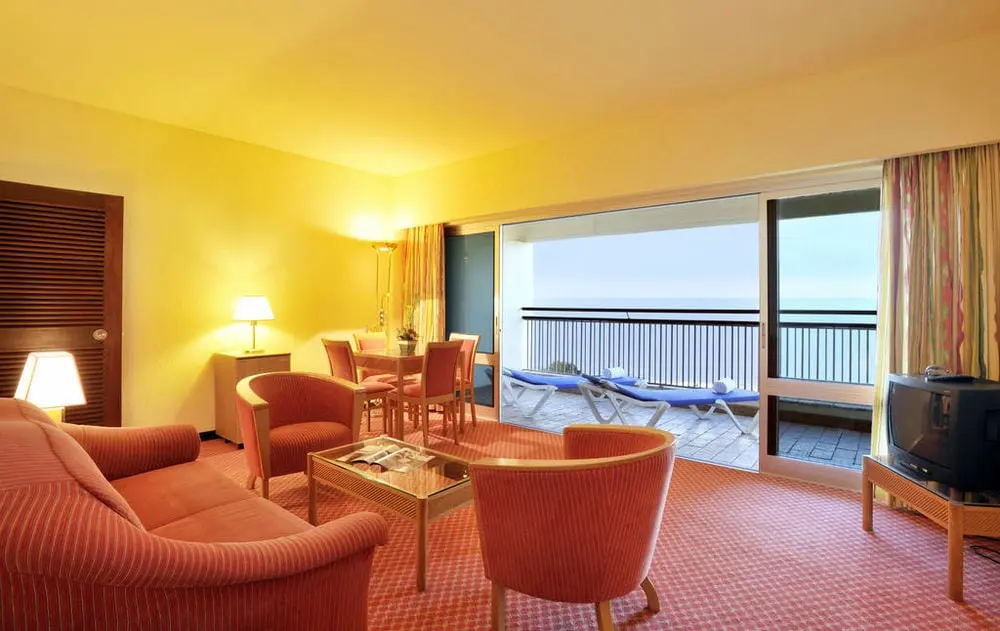 13 Suite (45 м2, мин. 2 макс. 3 или 2+2 чел.) номера с балконом и видом на море, 1 спальня с двуспальной кроватью, куда можно установить еще одну дополнительную кровать или детскую колыбельку, гостиная 29 м2 с диван-кроватью, столом и 4 стульями, небольшая зона кухни с микроволновкой и мини-холодильником, ванная комната с ванной и душем.