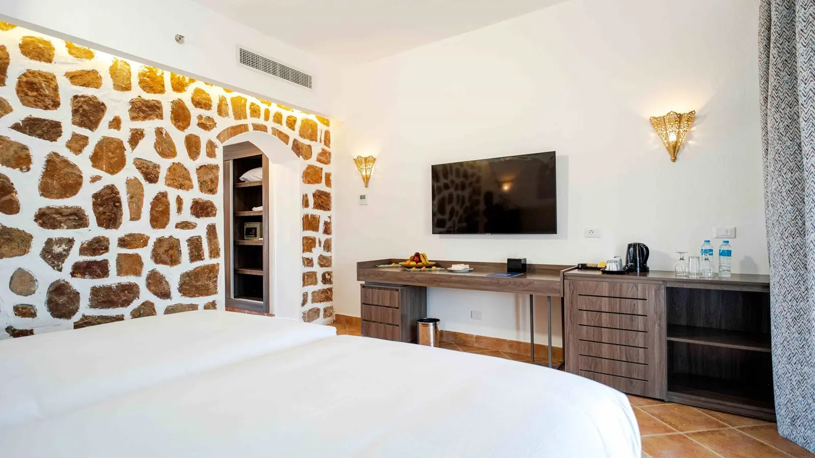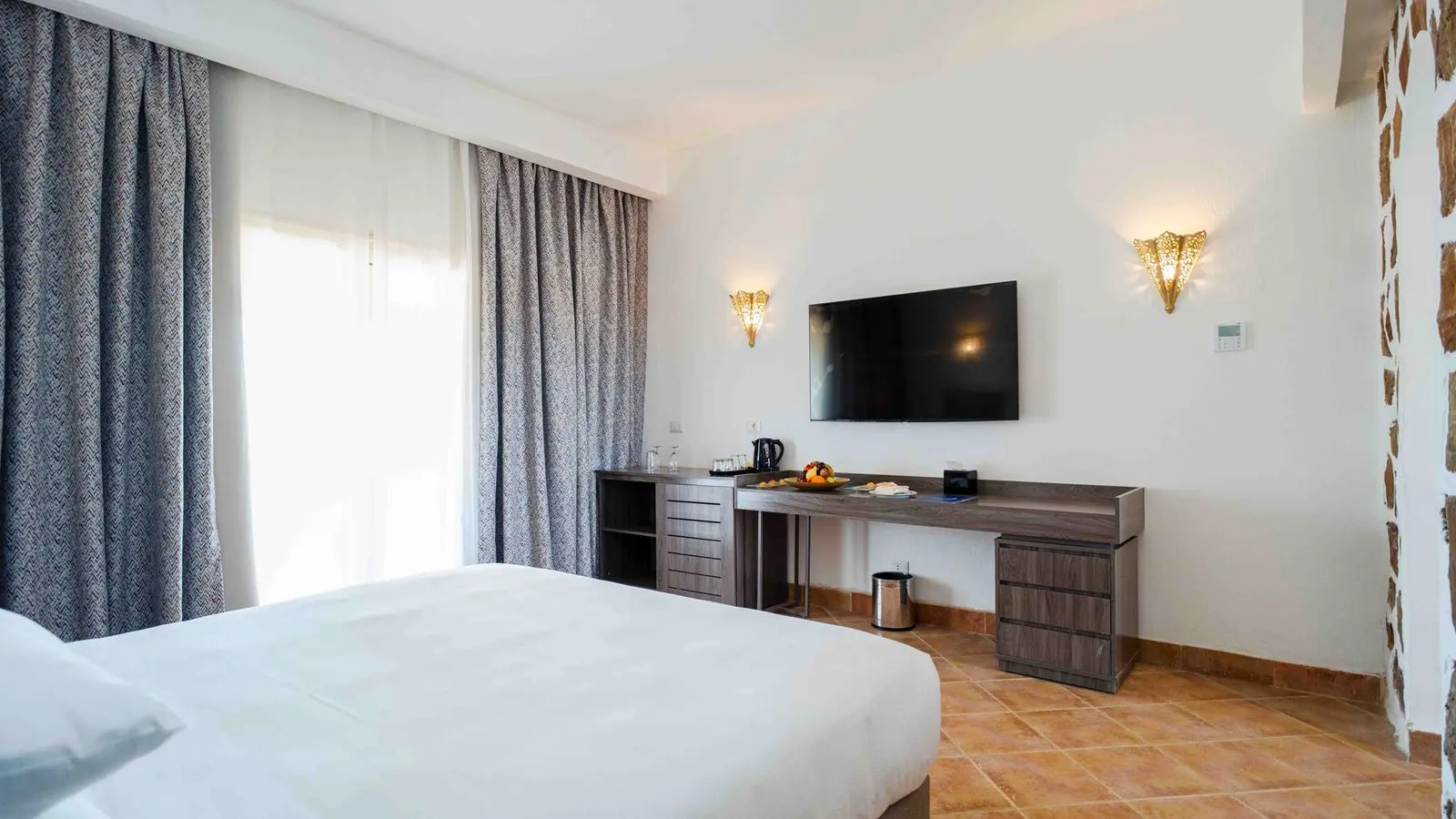 - Standard Room Sea View (1-2 этаж, 30 кв.м., спальня, 1 двуспальная или 2 односпальные кровати, балкон или терраса, вид на море, покрытие пола - плитка)