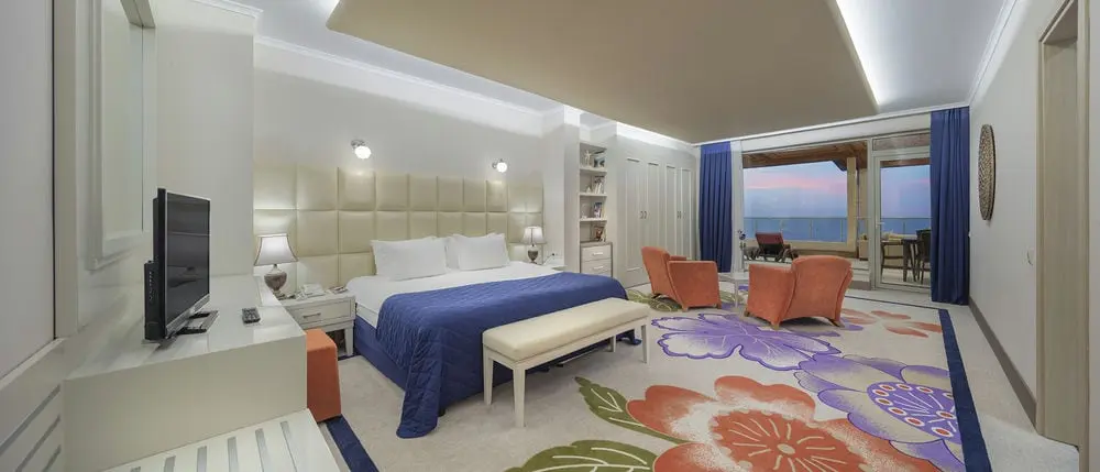 - DELUXE SUITE - 181 м², 2 номера с видом на море в главном корпусе. 1 спальня и 1 гостиная, 1 ванная комната (джакузи и душ), отдельный туалет, американская кухня, терасса, 3 взрослых + 1 ребенок;