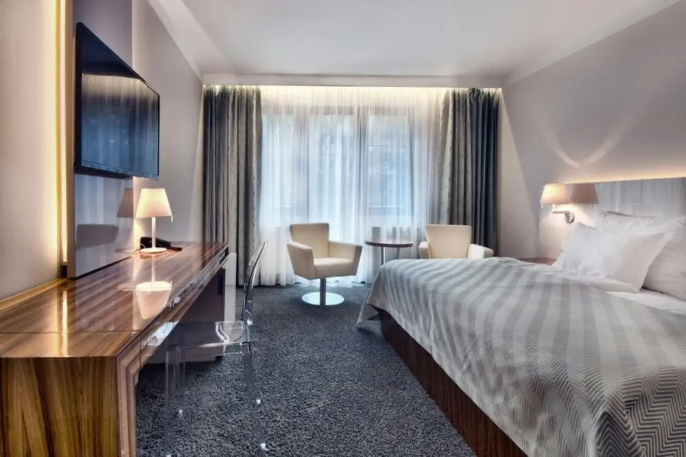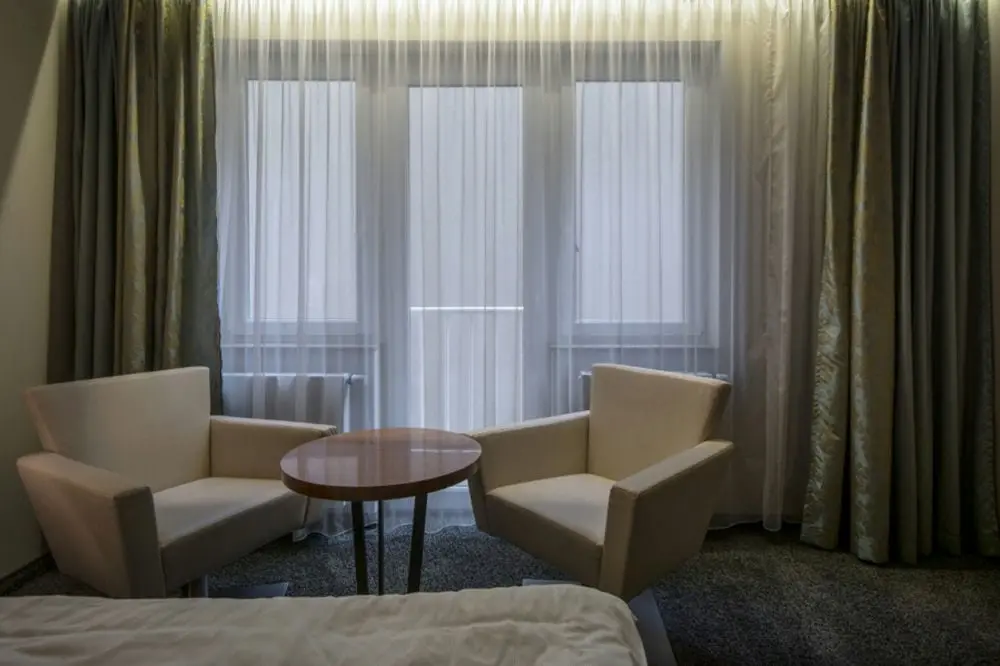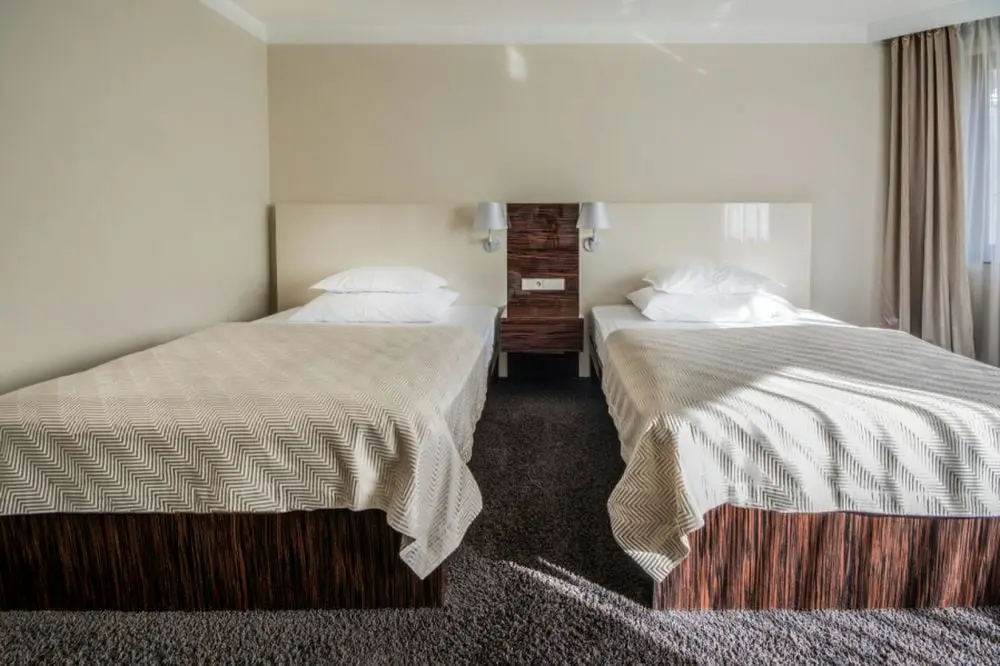 - Юниор Сьют - размер номера: 43 - 47 м2, вид: На улицу, парк или Карловарские Спа леса, мини-кухня, спальня отделенная от гостиной, кровать: две односпальные или одна двуспальная (2 кровати 200 х 100 см), возможность дополнительной кровати или детской кроватки. JUNIOR SUITE может быть соединен с LUX номером, чтобы получить большой CONNECT suite для 4 до 6 человек.