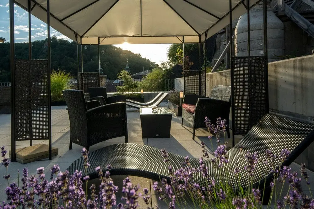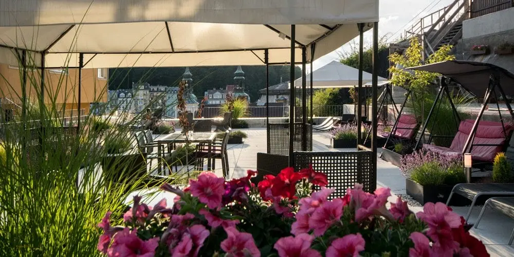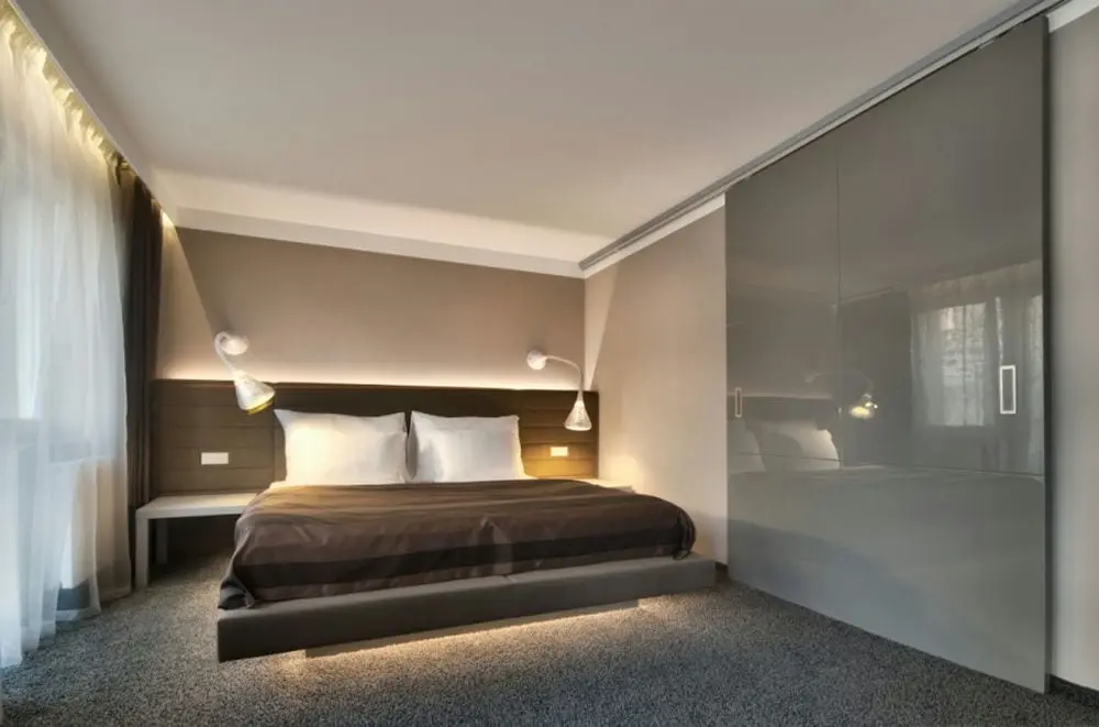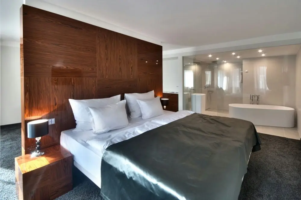 - Двухместный номер Дизайн - размер номера: 32 м2, вид: На новое здание Wellness Resort и прилегающие террасы и сады, кровать: две односпальные или одна двуспальная (2 кровати 200 х 100 см), возможность дополнительной кровати или детской кроватки. DESIGN номер может быть соединен со Стандартным номером, чтобы получить большой CONNECT suite для 4 до 6 человек.