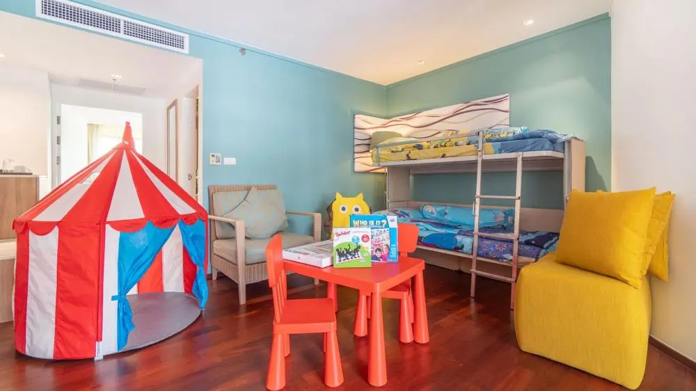- 1-bedroom Family Suite (43 кв.м., макс. 3/2+2(0-11) чел., спальня, кровать King-size, двухъярусная кровать, гостиная, ванная комната, балкон/терраса, вид на бассейн)