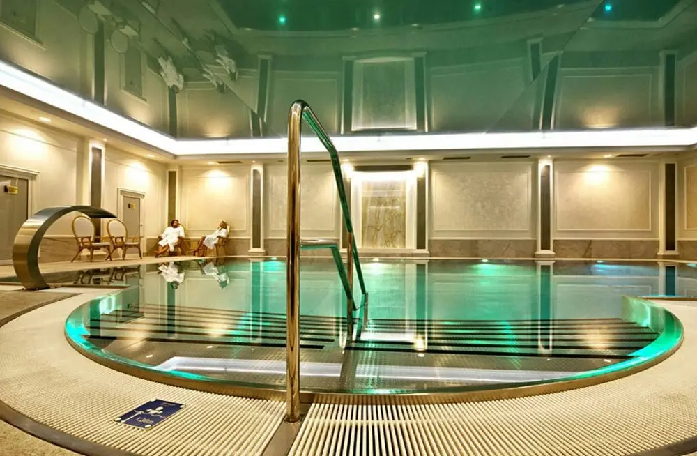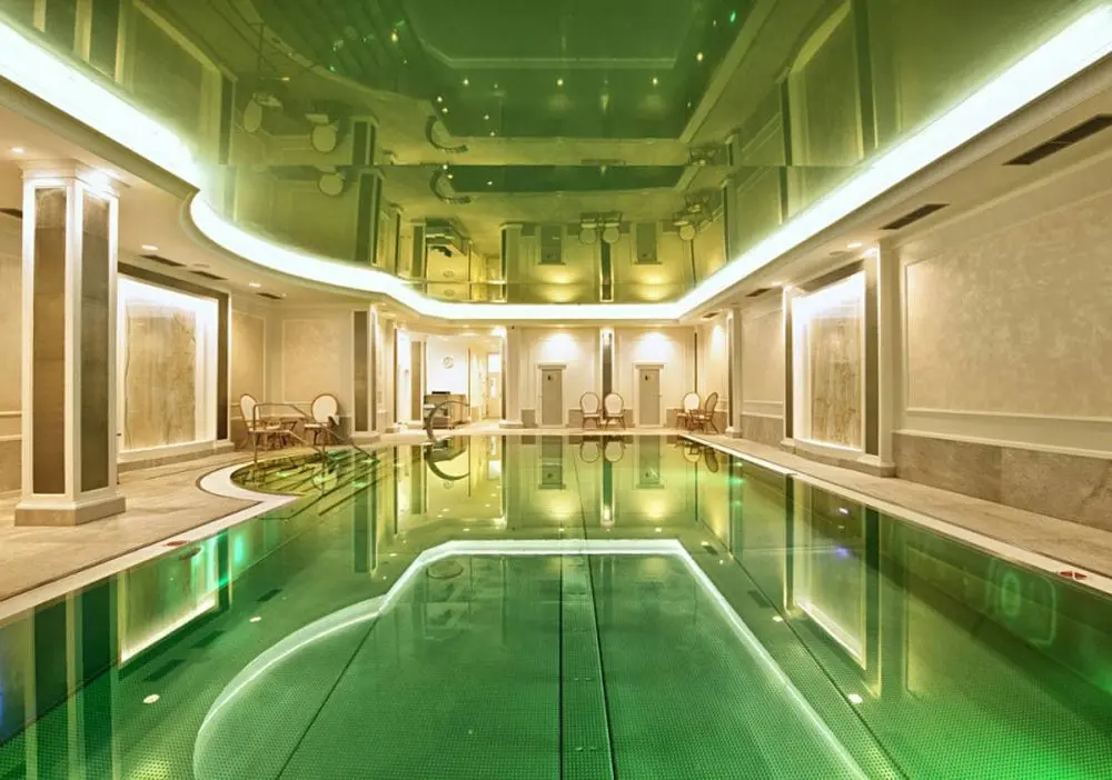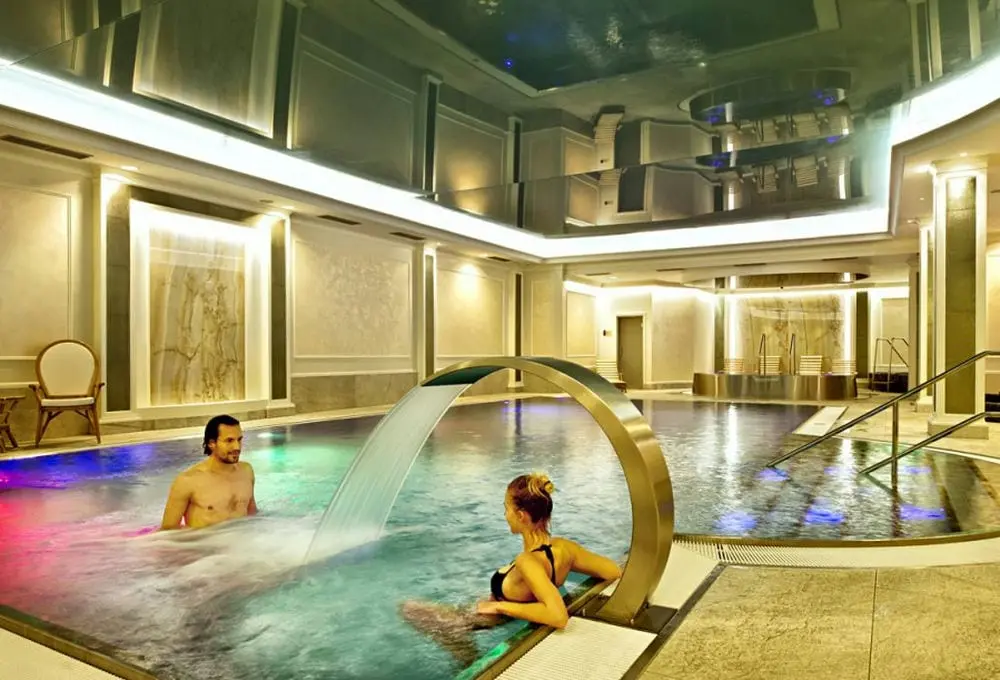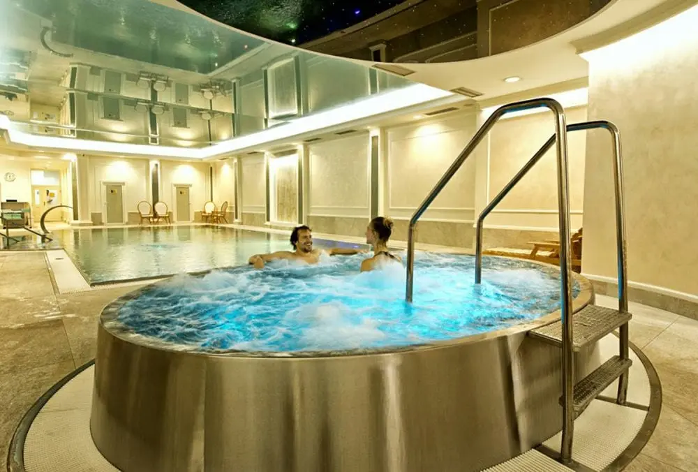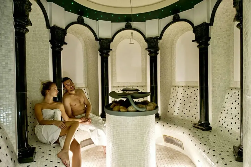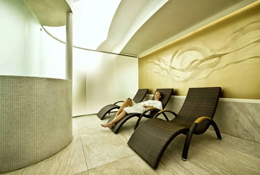 Финская сауна – мужская с ведром леденой воды и женская с крытым доступом к леденому колодцу, травянная сауна в римском стиле – женщины и мужчины вместе, соляный тепидарий – сухая процедура – женщины и мужчины вместе, сауна-скамейка инфракрасная, леденой колодец.