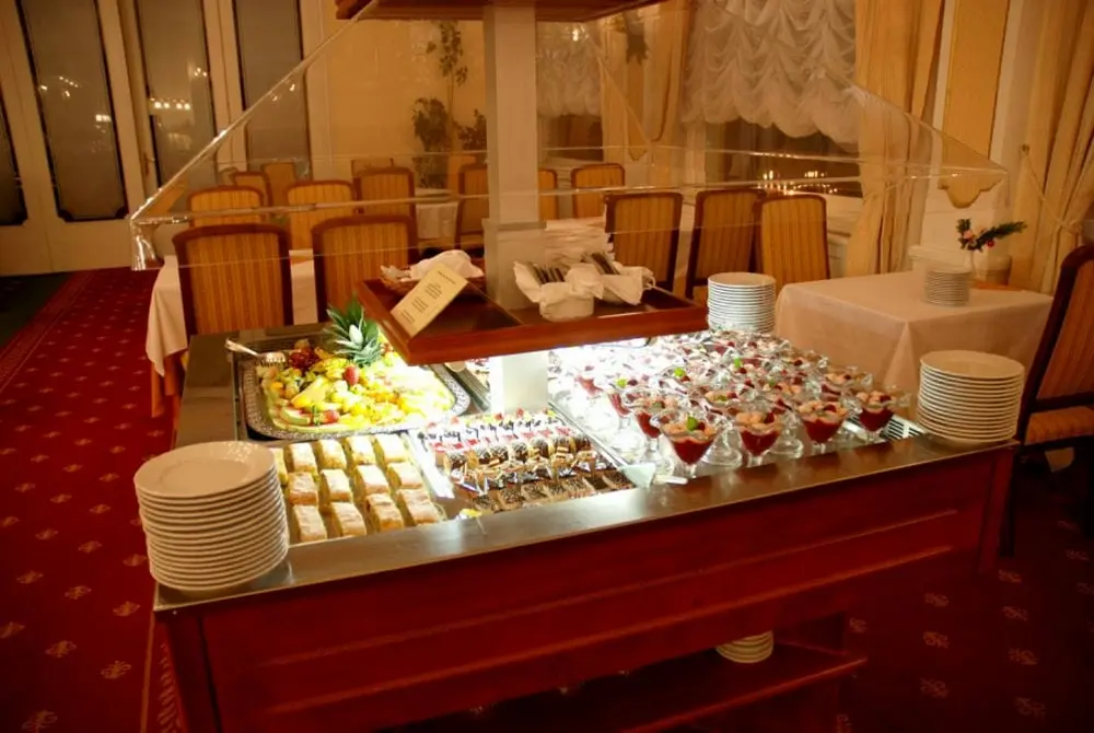 Гостям, которые заказали номера категории люкс, люкс А, апартаменты юниор, апартаменты или апартаменты с терассой предоставляется кроме шведского стола возможность заказать эксклюзивное меню шеф-повара, которoе входит в стоимость номера. Доплата за эксклюзивное меню шеф-повара для гостей, которые не заказали номера категории люкс, люкс А или апартаменты составляет 10 EUR с человека за меню. Пожалуйста, закажите меню не менее чем за 1 день. На завтрак входят в цену все напитки предлагаемые на шведском столе, то есть кофе, чай, вода, соки, молоко и другие. На ужин и на обед бесплатно подается столовая вода. Остальные напитки можно заказать у официанта– стоимость согласно прайс-листу. Гостям, которые заказали номера категории люкс, люкс А, апартаменты юниор, апартаменты или апартаменты с терассой предоставляется к обеду и ужину бесплатно бокал вина. Гостям нуждающимся в специальном диетическом питании (безглютеновое ...) поможет с выбором блюд наш обслуживающий персонал. В случае необходимости можно подготовить блюдо для гостя отдельно. Гостям с диабетом или с редукционным питанием для похудения пропишет питание наш гостиничный врач. В этих случаях получают гости сервированое меню подготовленое согласно их специфическим условиям. В случае, что даже богатое предложение шведского стола не по Вашему вкусу, есть возможность заказать блюда по нашему ala carte menu.