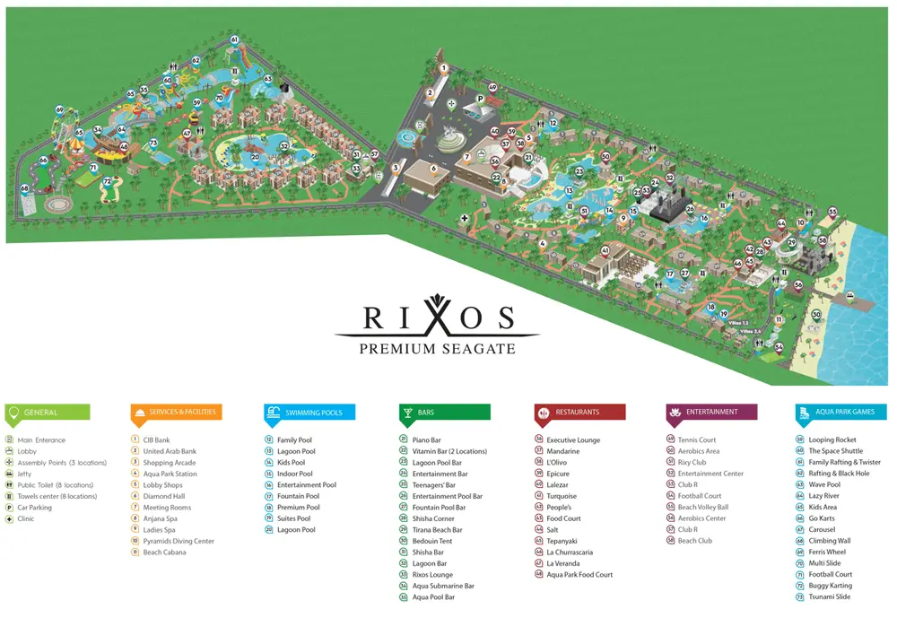 Rixos Premium Seagate предлагает концепцию Ультра Все Включено, что подразумевает под собой круглосуточный сервис. Oтель включает в себя 938 роскошных и элегантно оформленных номеров и вилл расположенных на двух линиях, собственный аквапарк с 23 горками для взрослых и детей, 8 бассейнов, 2 основных ресторана (на первой и второй линии), 16 ресторанов а-ля карт, 12 баров, 2 фуд-корта на пляже и в аквапарке, Спа-центр и услуги салона красоты, детский клуб, а также ежедневные спортивные и развлекательные программы. Гости отеля Rixos Premium Seagate и Rixos Sharm El Sheikh (adults friendly 18+) могут пользоваться услугами и территорией обоих отелей.