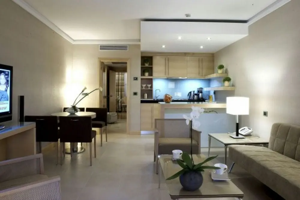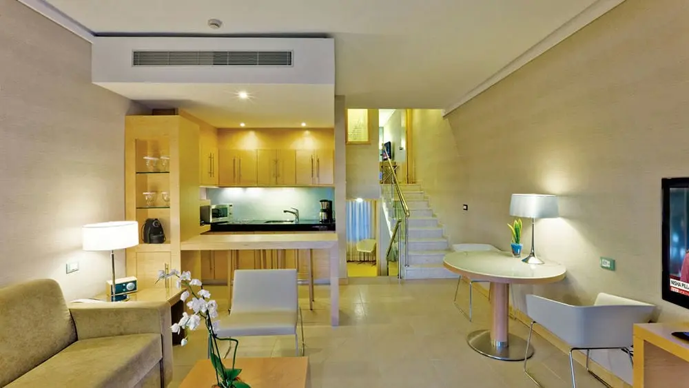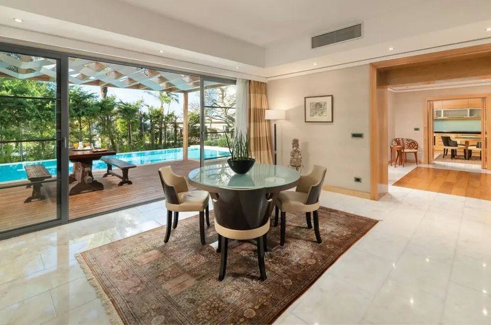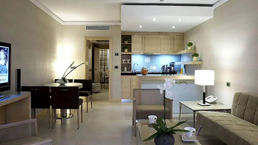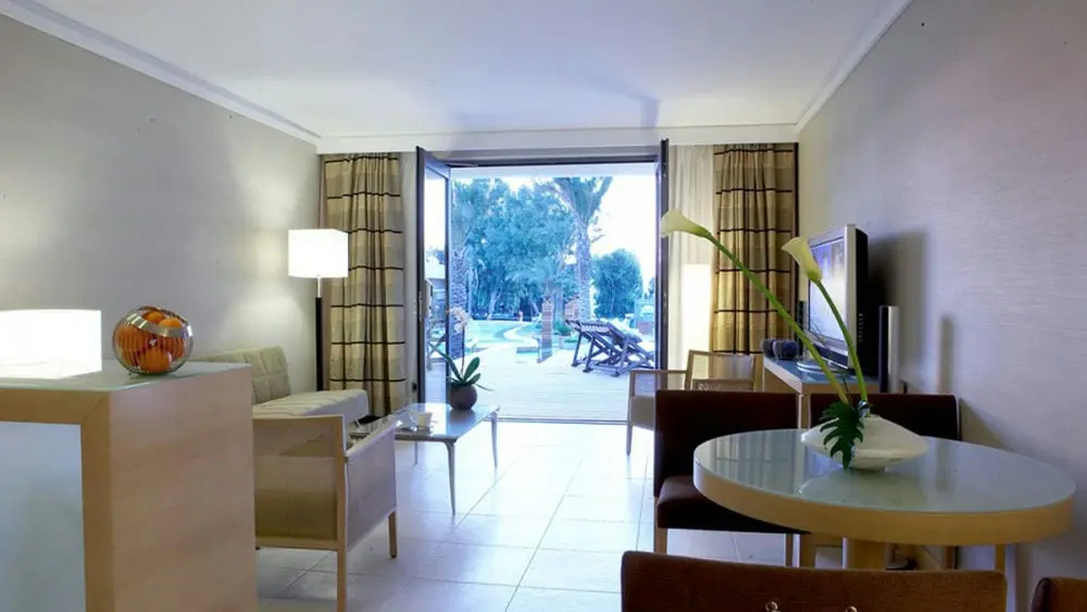 Номер с общим бассейном. Просторная гостиная с диван-кроватью и комфортабельной зоной отдыха, кухонный уголок, обеденный стол на 4 персоны, мини-бар. Небольшой коридор ведет к спальне с en-suite ванной с Jacuzzi. Гости могут завтракать и ужинать в частном секторе с правом на предоставление эксклюзивных услуг, скидка 20% на посещение Тренажерного зала, Сауны, Jacuzzi, Хаммама, Теннисного корта, Fine Dining Ресторана 12 Nissia.