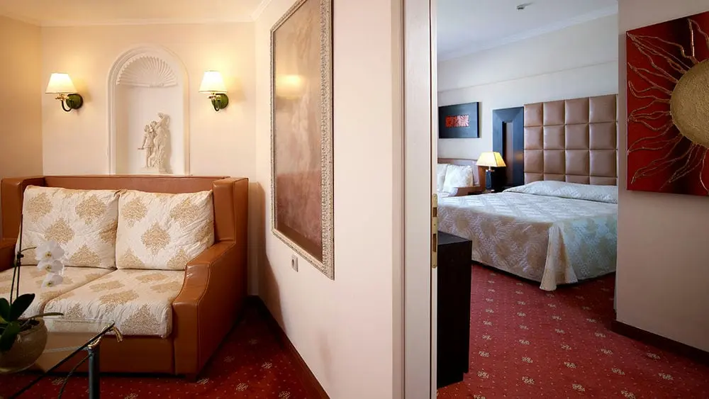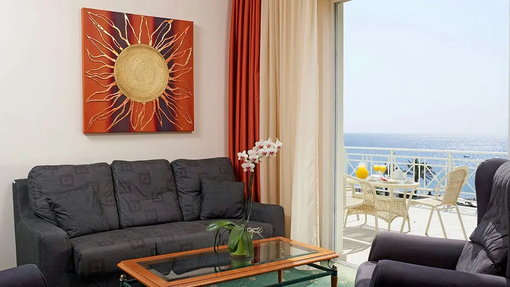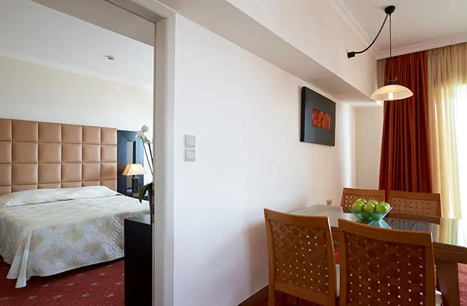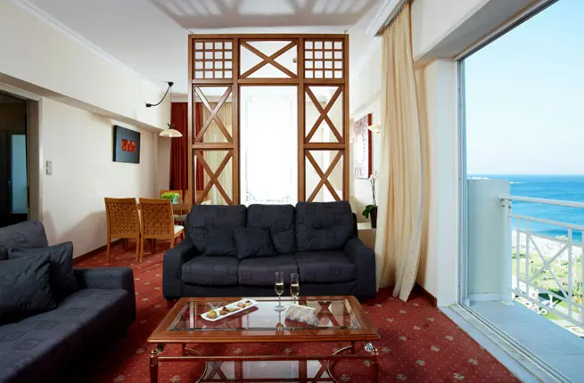Эти номера находятся в центральном здании и располагают просторным балконом (7 м2) с видом на море. Каждый номер отличает изящный декор, и он включает в себя: спальную комнату с двуспальной кроватью размера "queen-size" и отдельной гостиной с большим диваном-кроватью. Есть возможность объединения с двухместными номерами Superior Deluxe, по запросу.