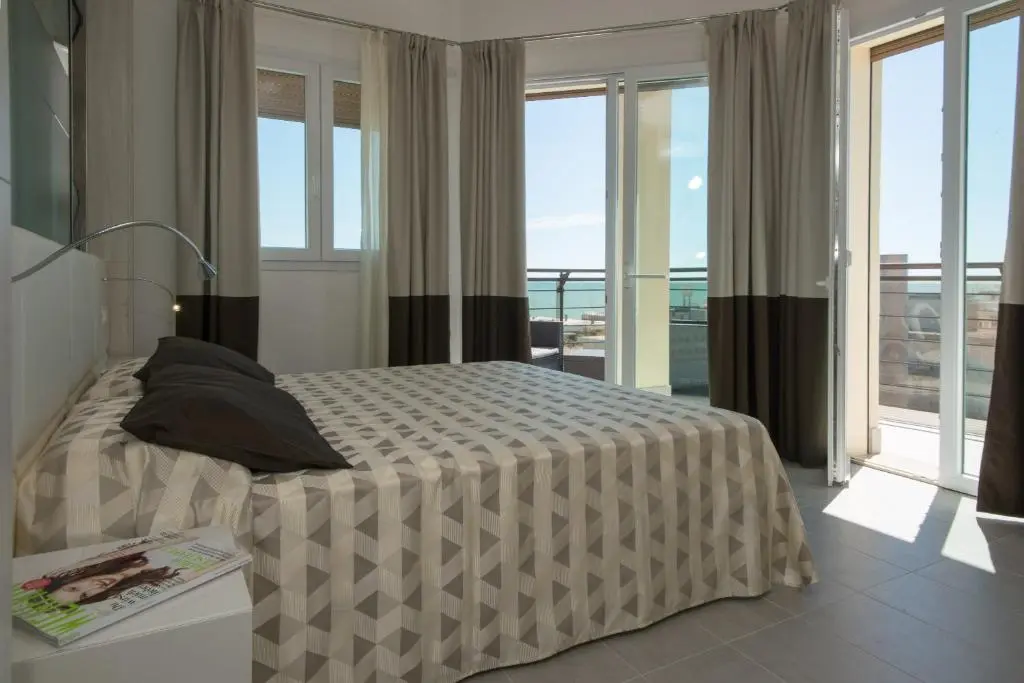 - Deluxe (20 кв.м., 8-й этаж, спальня, двуспальная кровать, ванная комната, балкон, боковой вид на море и город)