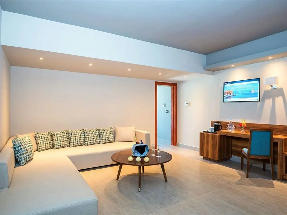 Superior Suites Private Pool SV Спальня и гостиная, диван, частный бассейн, вид на море.