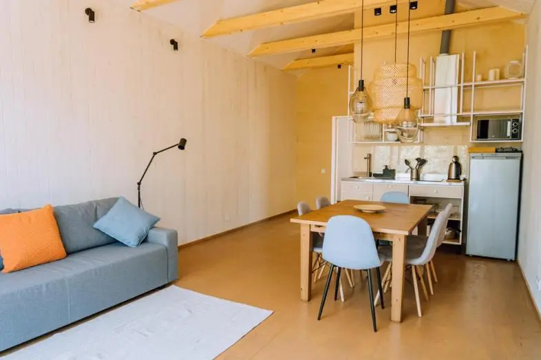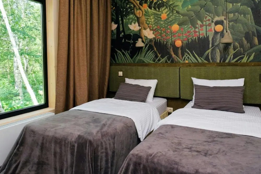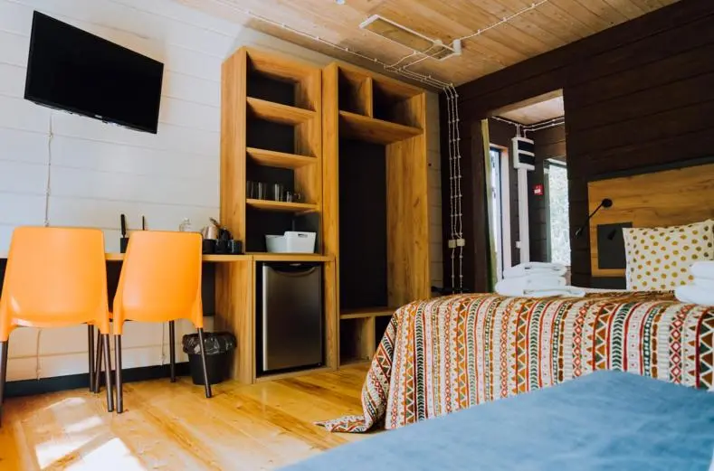 Гостевой дом «Forest» (22 м2, макс. 2+1 чел., 1 двуспальная и 2 односпальные кровати, есть мини-холодильник, цифровое TV, стол, стулья, диван и система хранения одежды, некоторые домики оборудованы мангальными зонами);