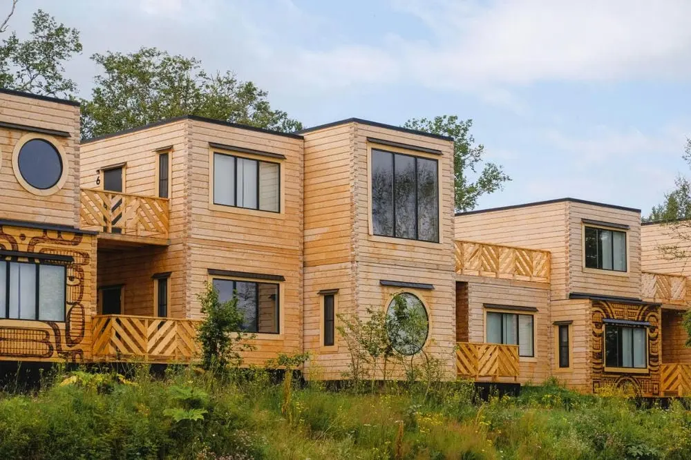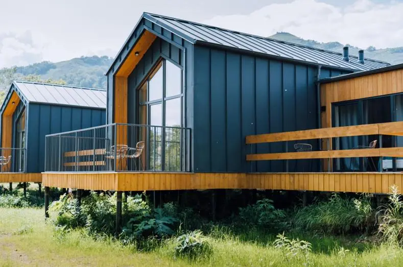 Гостевой дом «Идеальный куб» (142 м2, макс. 8 чел., на берегу озера Микижа, 4 спальни, в каждой двуспальные кровати, гостиная объединена с кухней, есть мини-бар и 4 ванных комнаты, мангальная зона, купель с водой из термальных источников на террасе).