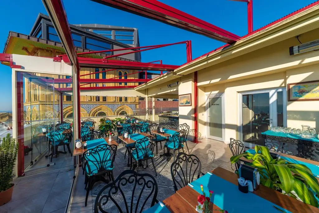 Каждое утро в отеле сервируют завтрак "шведский стол" из традиционных блюд турецкой кухни. Летом гости могут поесть на террасе отеля. В лобби-баре подают алкогольные и безалкогольные напитки.