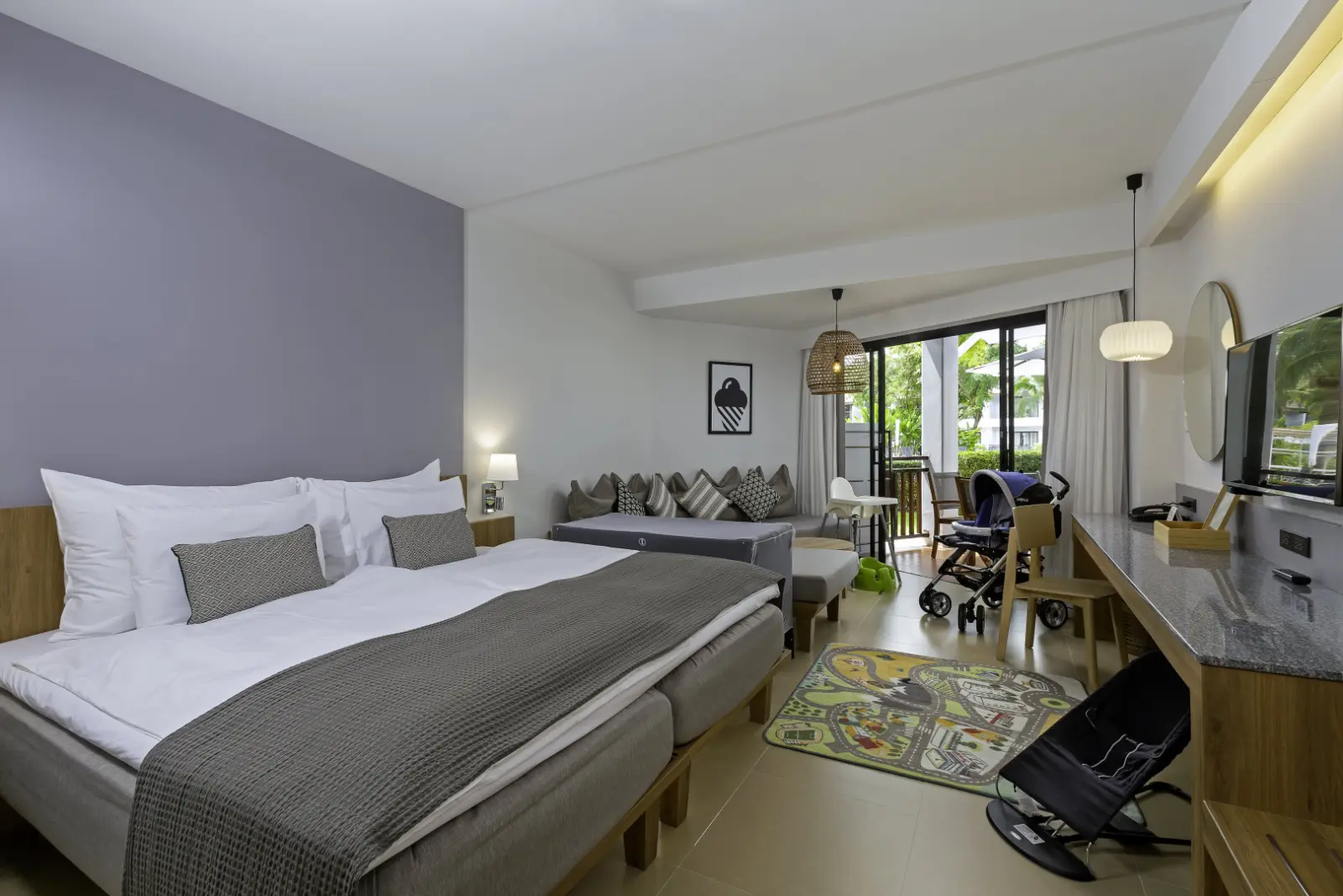 - Happy Baby Studio Room (44 кв.м., 1-й этаж, спальня, кровать King-size или 2 односпальные кровати, кухня, ванная комната, закрытая терраса с воротами, вид на бассейн, детские принадлежности (детская кроватка, детский стульчик для кормления, коляска, коврик для кормления, детский стульчик, няня Bumbo, детская посуда и столовые приборы, детская ванночка, нескользкий коврик для ванной, табурет в ванной, пластиковый горшок, сейф, замки для ящиков, шезлонги и зонтик на огороженной садовой террасе))