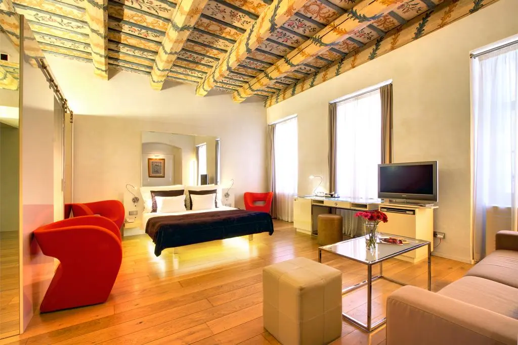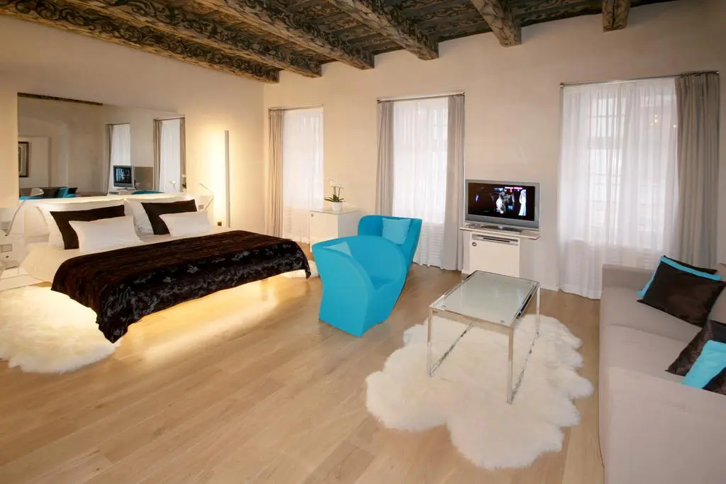 Он предлагает исключительную и оригинальную среду, запроектированную архитектурным бюро «AI DESIGN» в сотрудничестве с ателье «Eva Jiřičná Architects» в Лондоне, который чувствительно всажен в пространство исторического дома «У Трех Аистов» и создает совершенную гармонию сохранившегося интерьера в стиле эпохи Возрождения с самым современным дизайном.