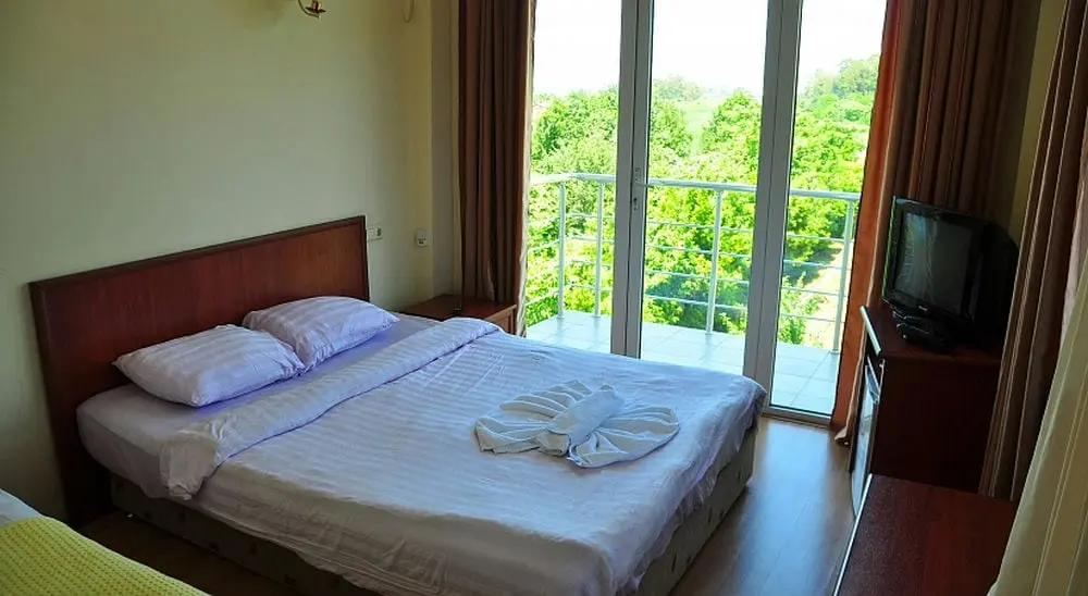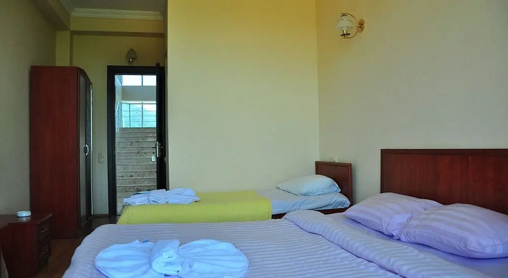 - Стандартный двухместный номер (с возможностью трехместного размещения) – количество 24. Однокомнатный номер, в номере двухспальная кровать (king size) и односпальная кровать, кондиционер, холодильник, телевизор, ванная комната, балкон с видом на море и горы.