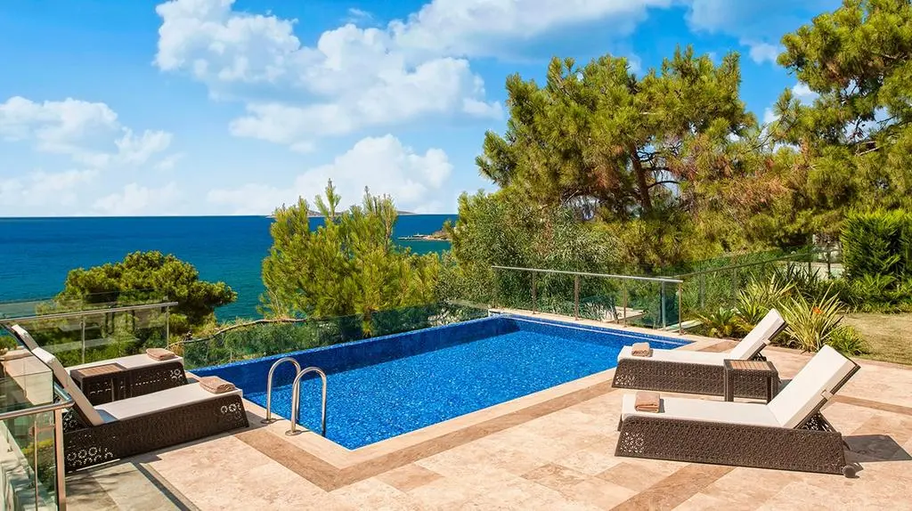 Poseidon Villa (вид на море; 1-й этаж: открытый бассейн, терраса,гостиная, спальня с ванной, столовая зона, кухня, туалет; 2-й этаж: 3 спальни с дверью, 3 ванные комнаты, балкон, терраса;макс. 8 чел., 330 м², Vip-сервис)