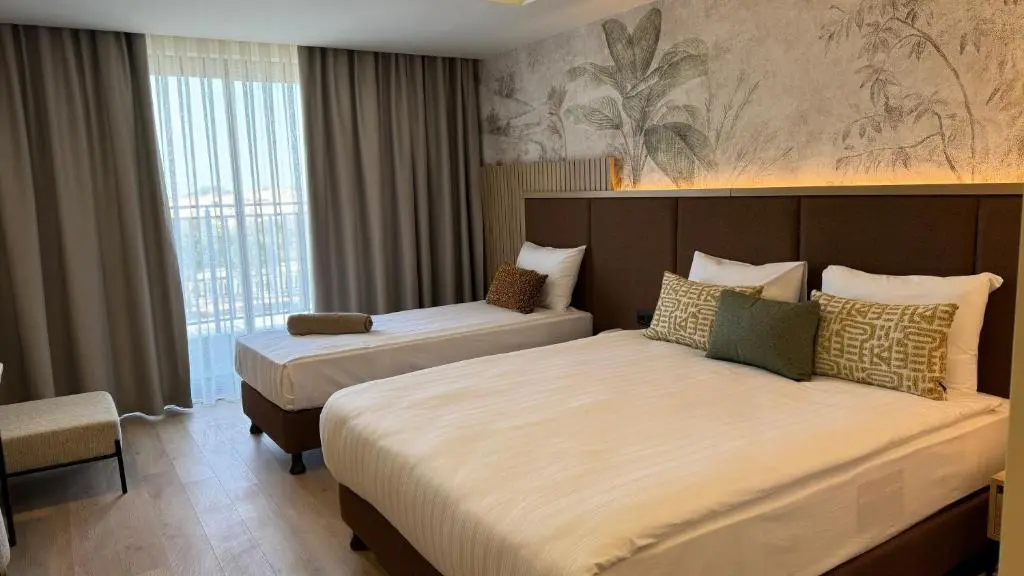 Номер: на 1-м этаже здания, 30 кв.м, двуспальная и односпальная кровати, балкон, вид на бассейн