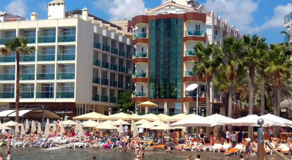 На берегу моря в 100км от аэропорта Даламан в городе Мармарис.
